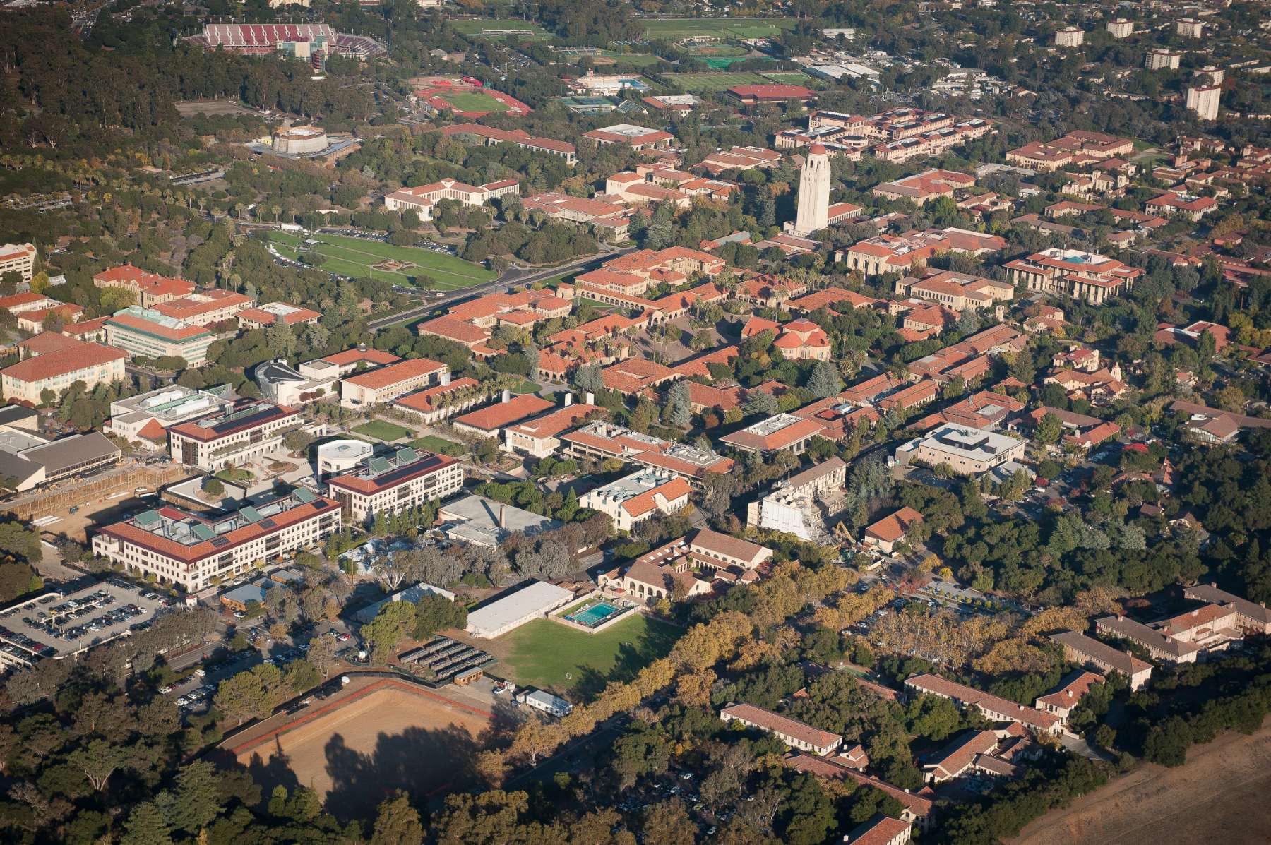 Aerial view of campus facing east, 2011. The new Science and Engineering Quad is visible on the left, with the final building still under construction. Then known as Building 4, that building would later become the Shriram Center for Bioengineering and Chemical Engineering. | Linda A. Cicero/Stanford News Service.