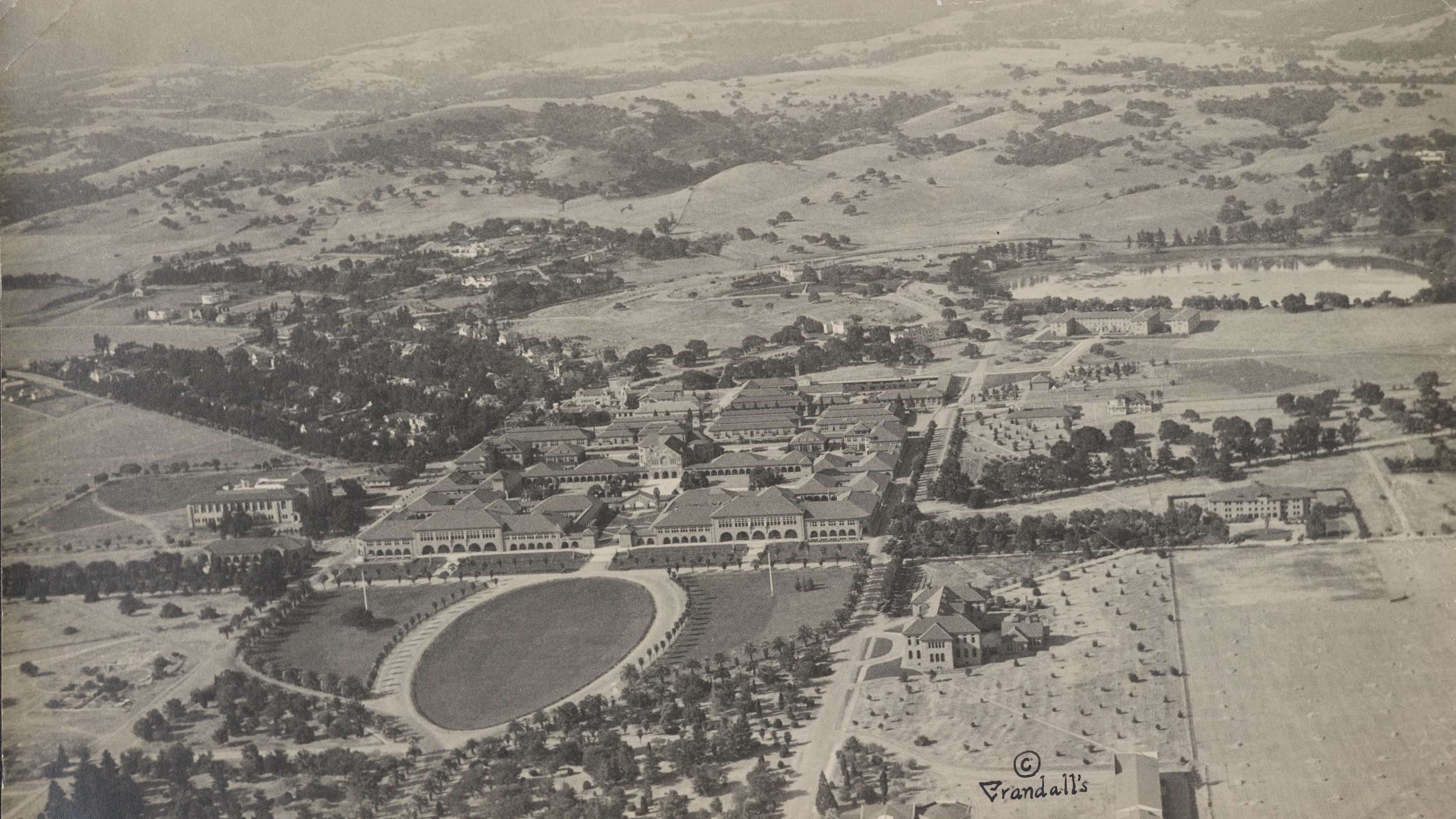 Aerial view of the Stanford campus, facing south, circa 1925. | Berton W. Crandall photographs, Hoover Institution Library & Archives.